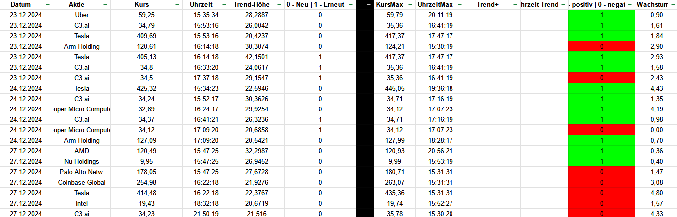1. Woche der gesammelten Trend-Meldung inkl. dem Versuch die Meldungen zu analysieren. Bisher wurde aber nur der Tageshöchstkurs gesammelt, was bewirkt, dass einige Trends in der vorletzten Spalte rot markiert wurden, da der Höchstkurs am Tag zeitlich vor der Trend-Meldung lag. Um das Problem zukünftig in den Griff zu bekommen, wird zusätzlich der Höchstkurs nach einer Trend-Meldung ebenfalls gesammelt und zu Analyse-Zwecken herangezogen.