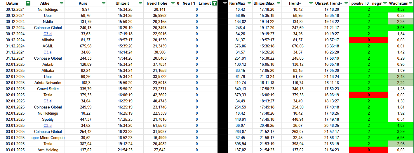 In den Auswertungen werde ich mich in der ersten Zeit aber erstmal nur auf die Trend-Meldungen stürzen, wo eine Aktie neu als Trend gemeldet wurde (also kein wiederholter täglicher Trend – diese sind in den Auswertung jeweils in Spalte F erkennbar: 1 = erneuter Trend, 0 = neuer Trend)